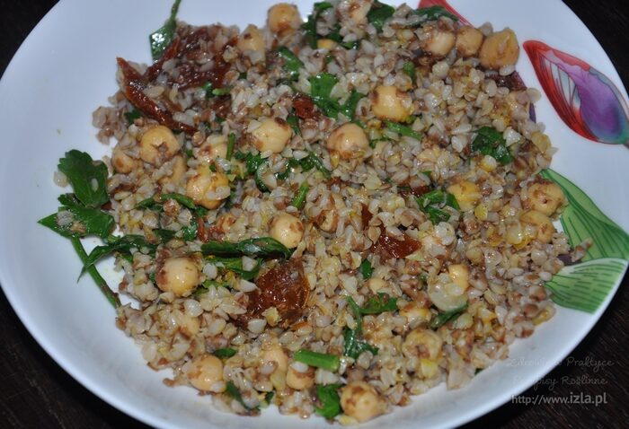Kolejny przepis na kaszę gryczaną. Proste szybkie danie, gdy masz ugotowaną kaszę i cieciorkę. Jeżeli robisz np kotlety z cieciorki możesz zostawić trochę ciecierzycy, lub w ostateczności wykorzystać cieciorkę z puszki …