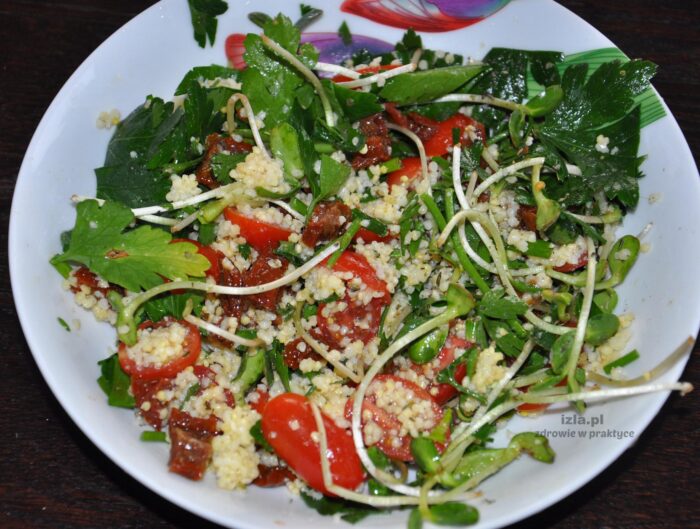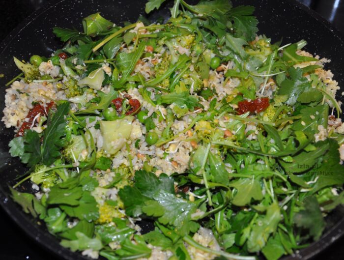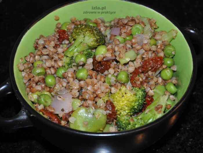 Kasza z brokułami, suszonymi pomidorami całe mnóstwo zieleniny:) Czego chcieć więcej:) Do sałatki dodałam resztkę brązowego ryżu, kiełki , natkę pietruszki. Jeżeli lubisz cebule , możesz wcześniej ją lekko zeszklić …